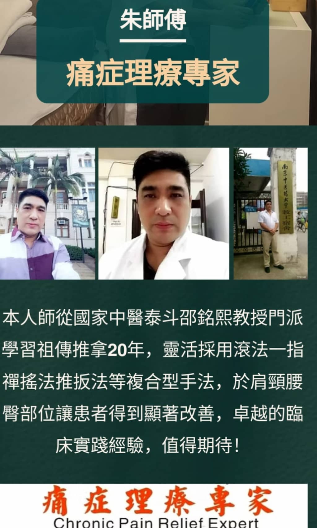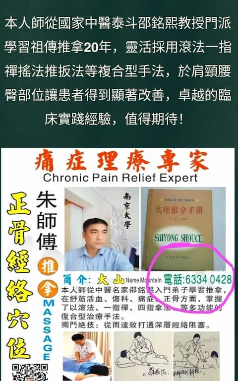 南京大學文憑、香港高級推拿師、師從邵銘熙入門弟子、