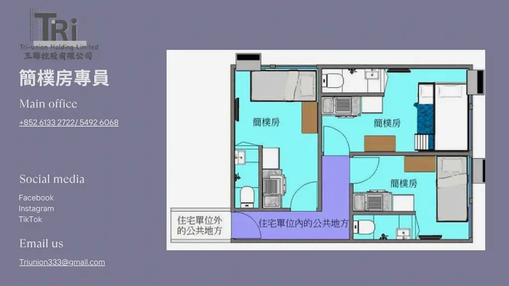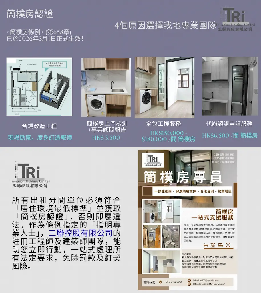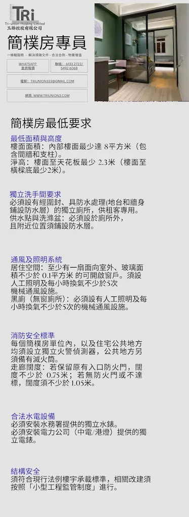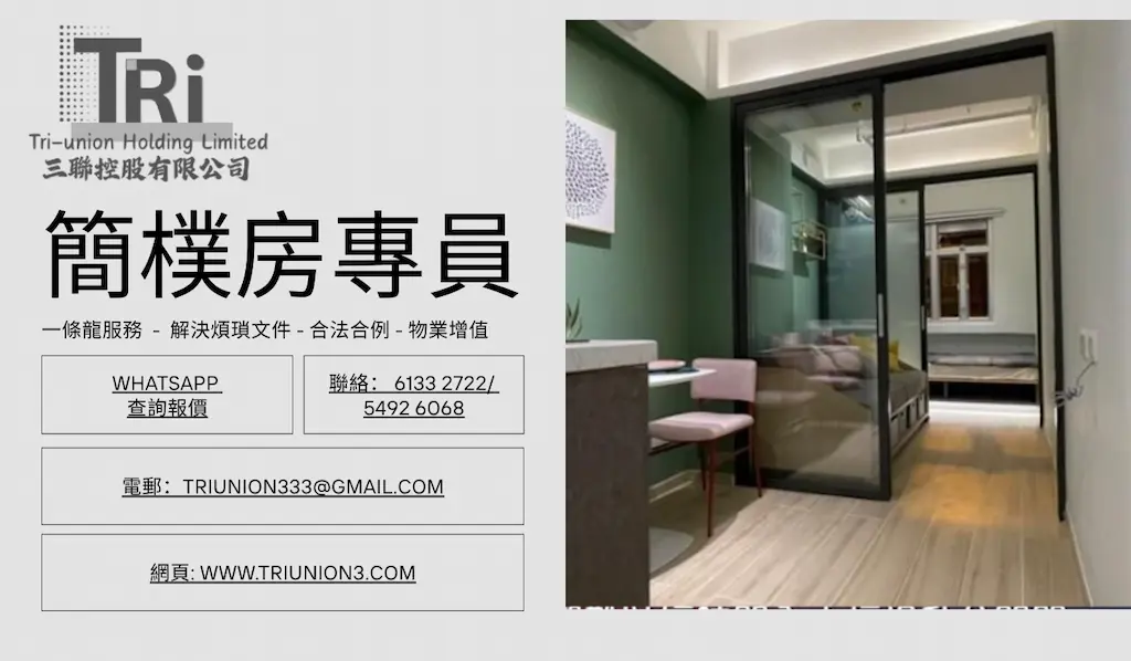 簡樸房專員 三聯控股有限公司 Tri Union Holding LimitedWhatsapp/ Tel: 6133 2722/ 5492 6068www.triunion3.comEmail: [email protected]簡樸房認證, 劏房申請寬限, 裝修認證一條龍服務。