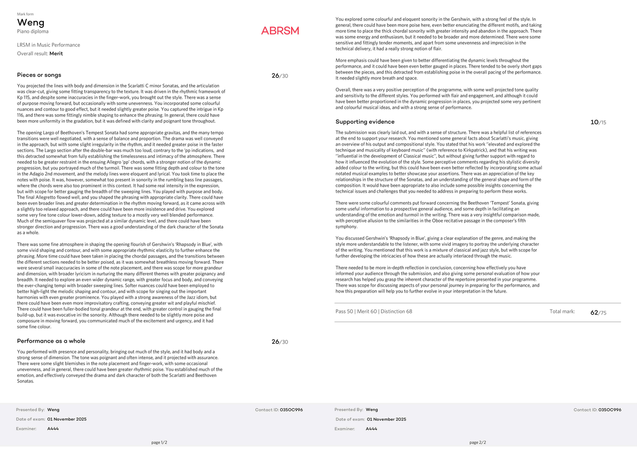 LRSM/ARSM/ATCL/AMUSTCL/LMUSTCL/LTCL/SSPZ/TMPZ 考獲優異成績 及其他演奏文憑考試成績