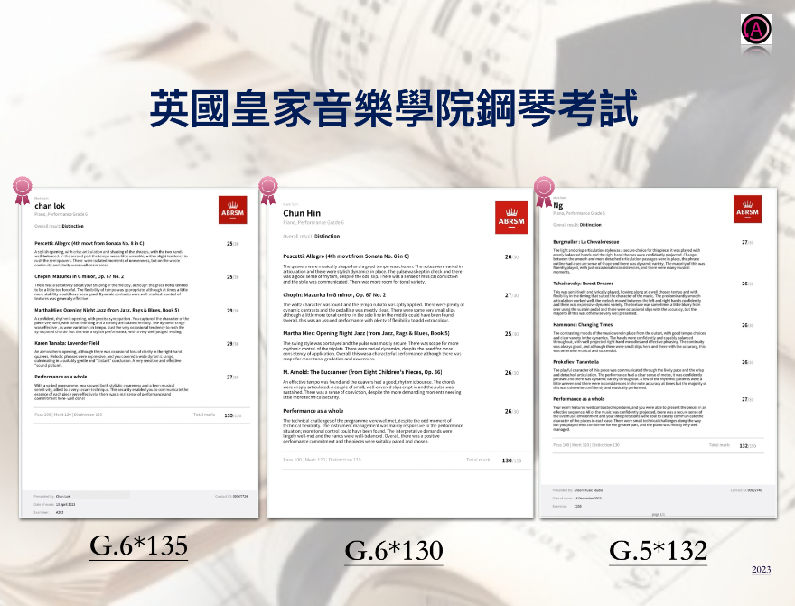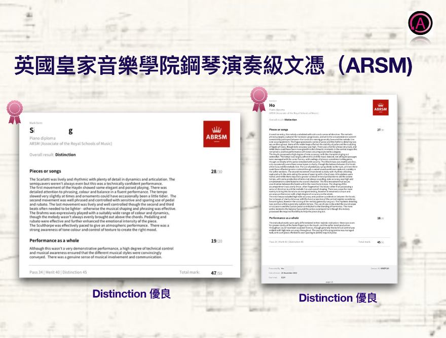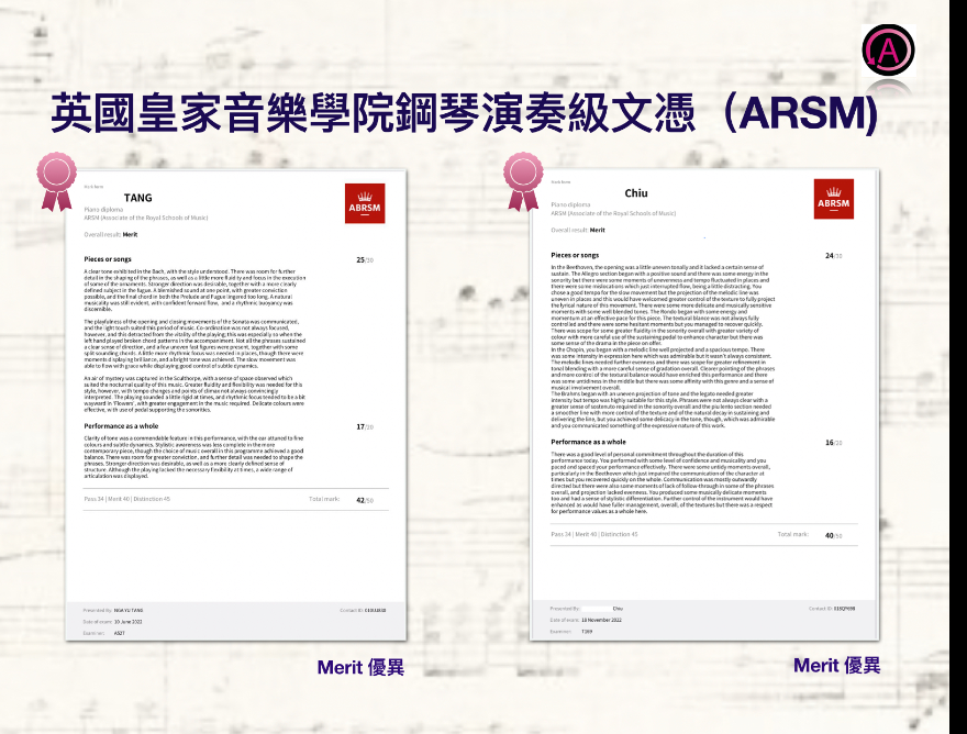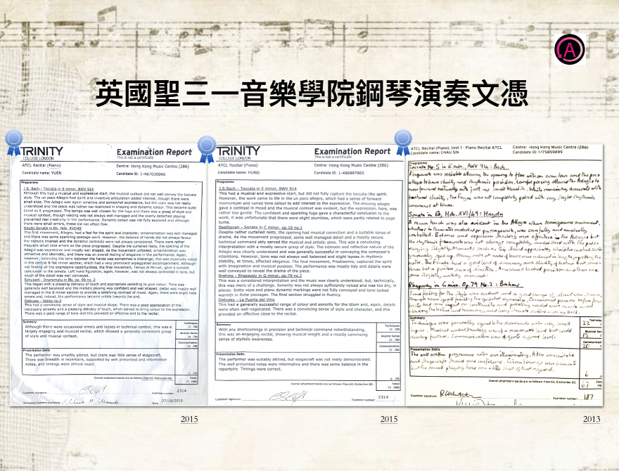 • 英國聖三一音樂學院鋼琴演奏文憑(ATCL)