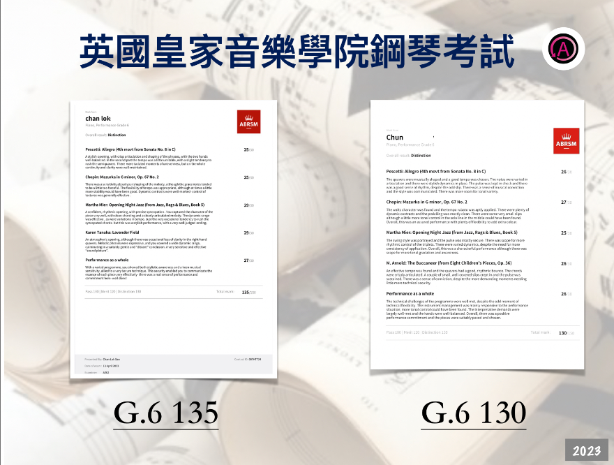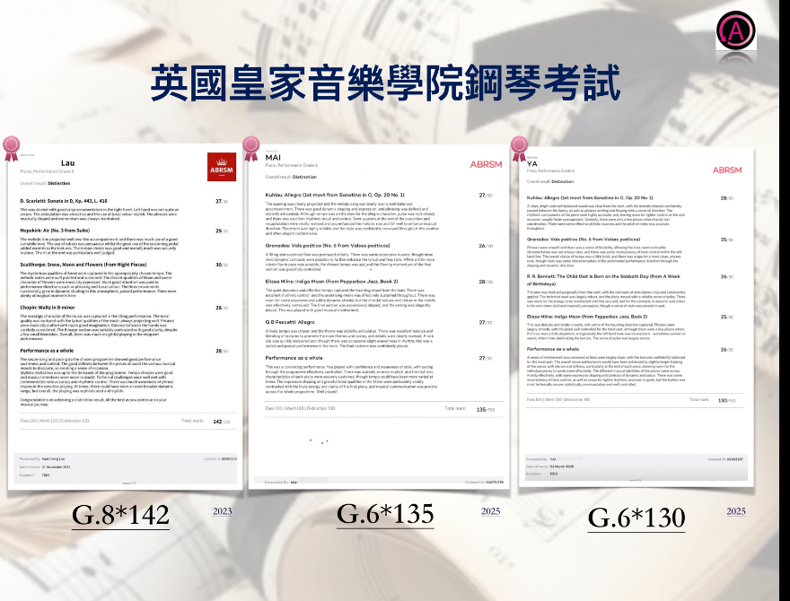 • 英國皇家音樂學院小提琴八級